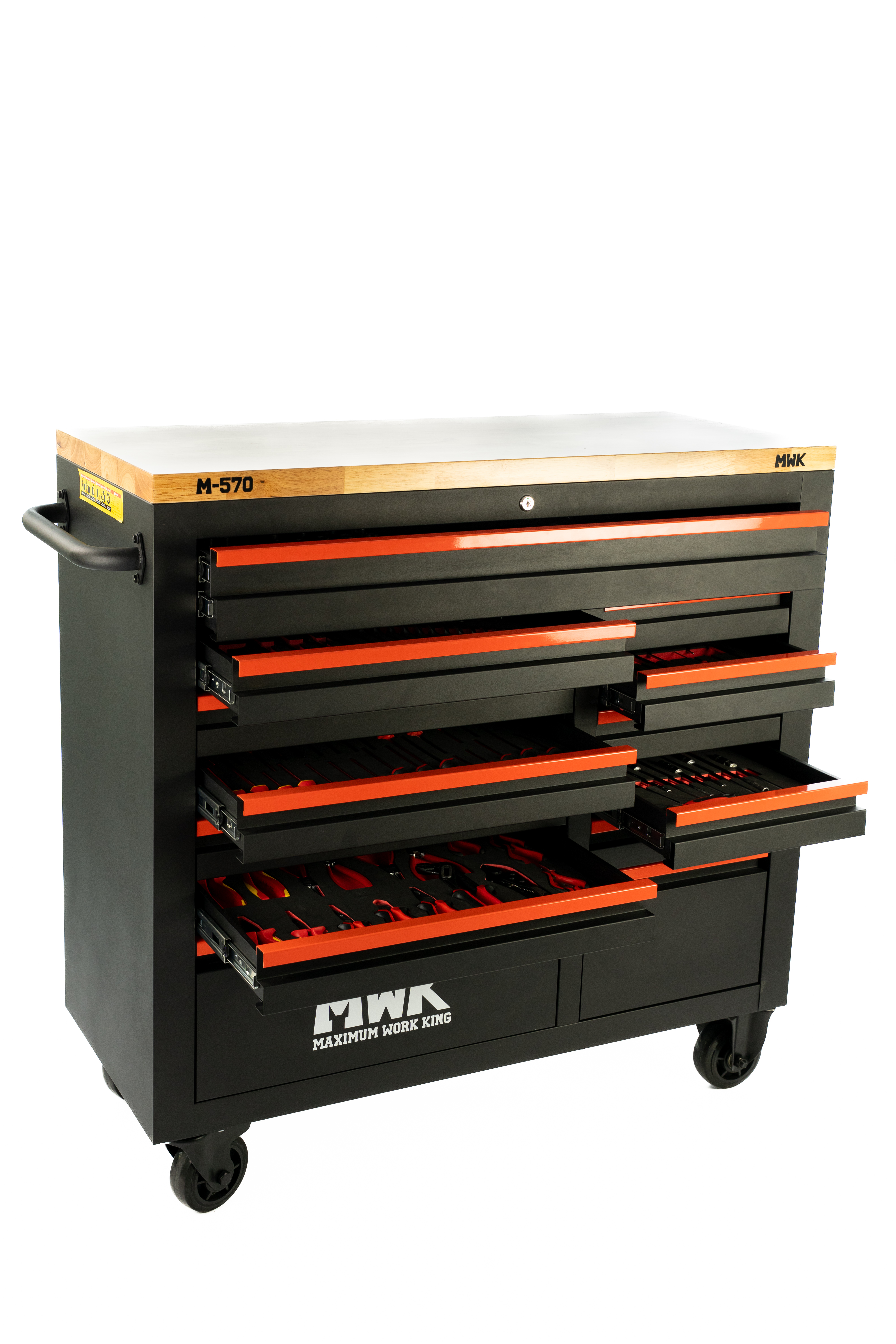 Take your work to the next level with the MWK M-570 tool cart. This robust cart is fully equipped with 281 professional tools, neatly arranged in luxurious soft foam inlays. The 13 ball-bearing drawers, the solid wood worktop, and a convenient power supply with a power outlet and USB connection make this the perfect work companion.
